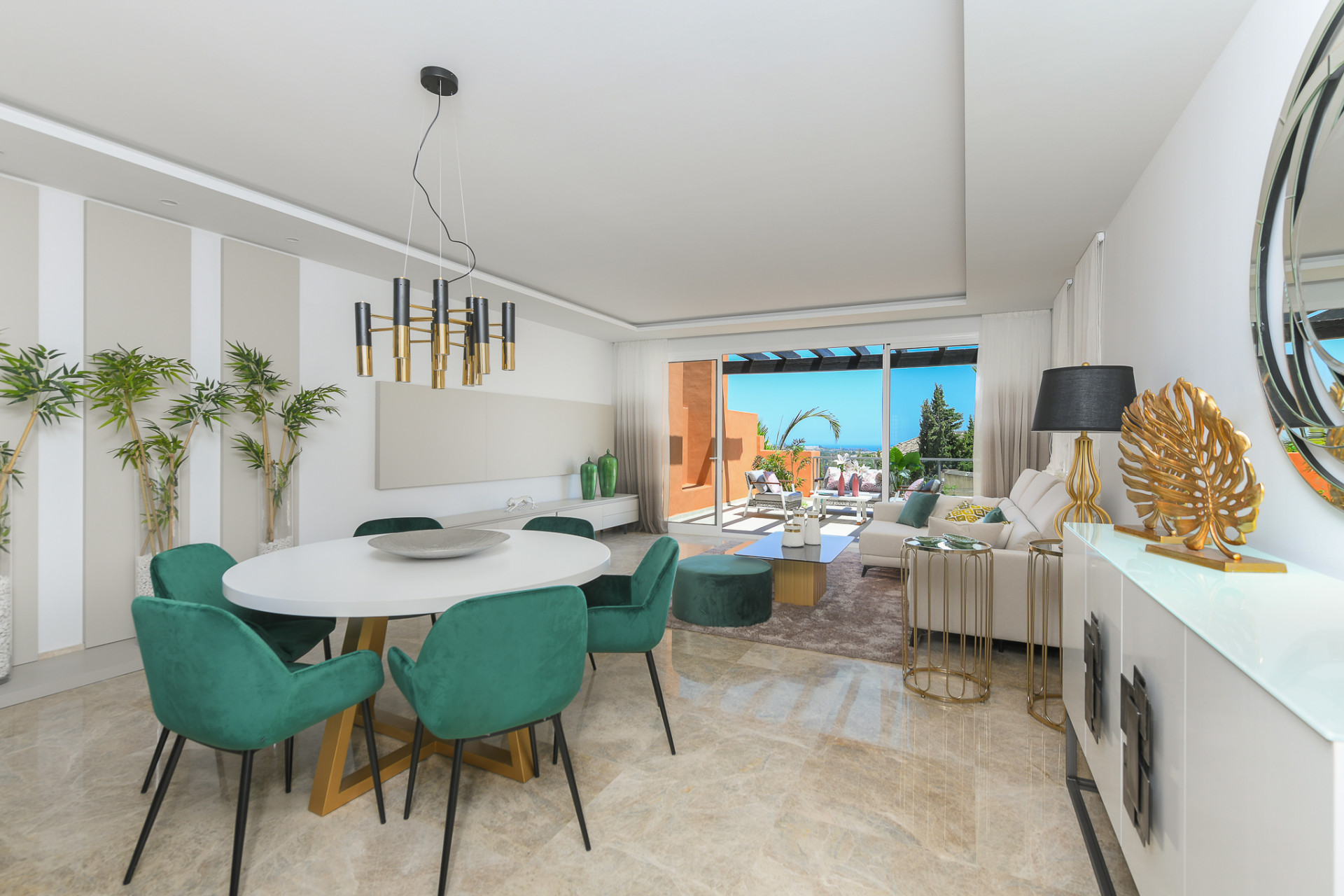 With a typically Mediterranean architecture, designed by a renowned group of architects, Alminar perfectly combines a landscape impregnated with sun, surrounded by gardens and palm trees, in the Golf Valley, next to the famous golf courses of Los Naranjos, Aloha and Las Brisas , just 5 minutes from Puerto Banús.